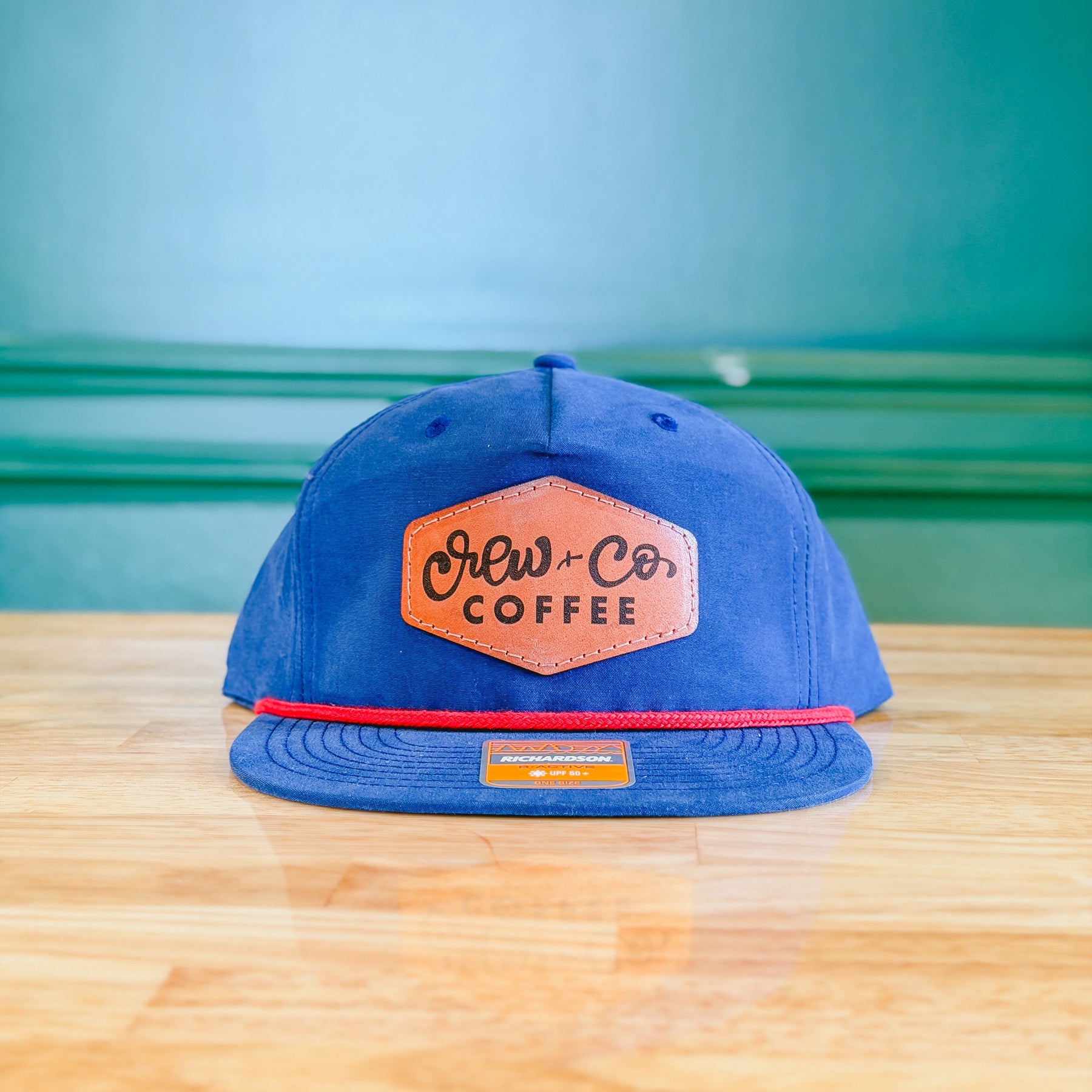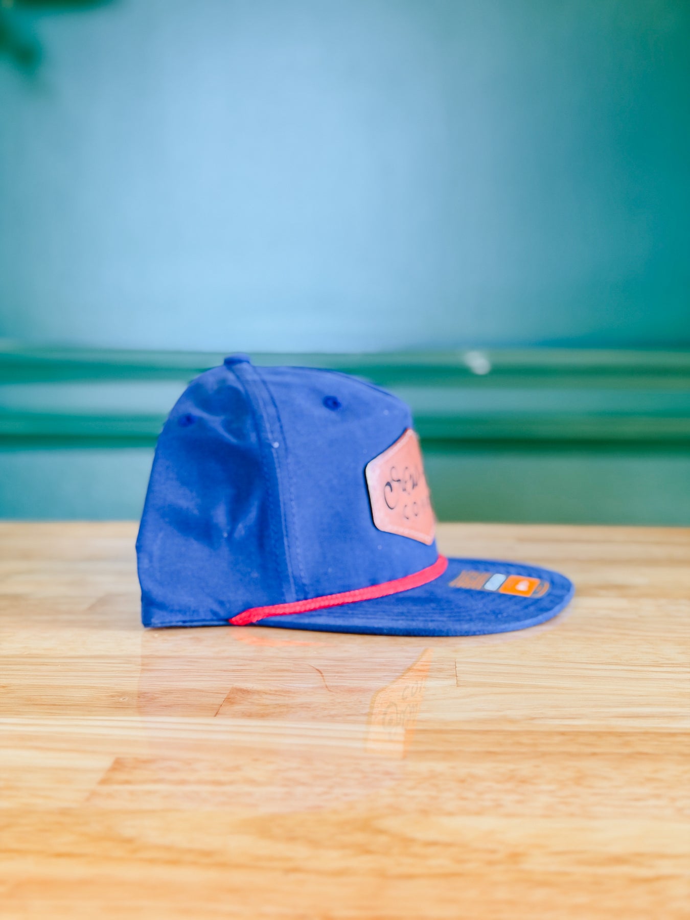 ![Crew + Co Coffee Leather Patch Hat • Navy with Red Rope]()