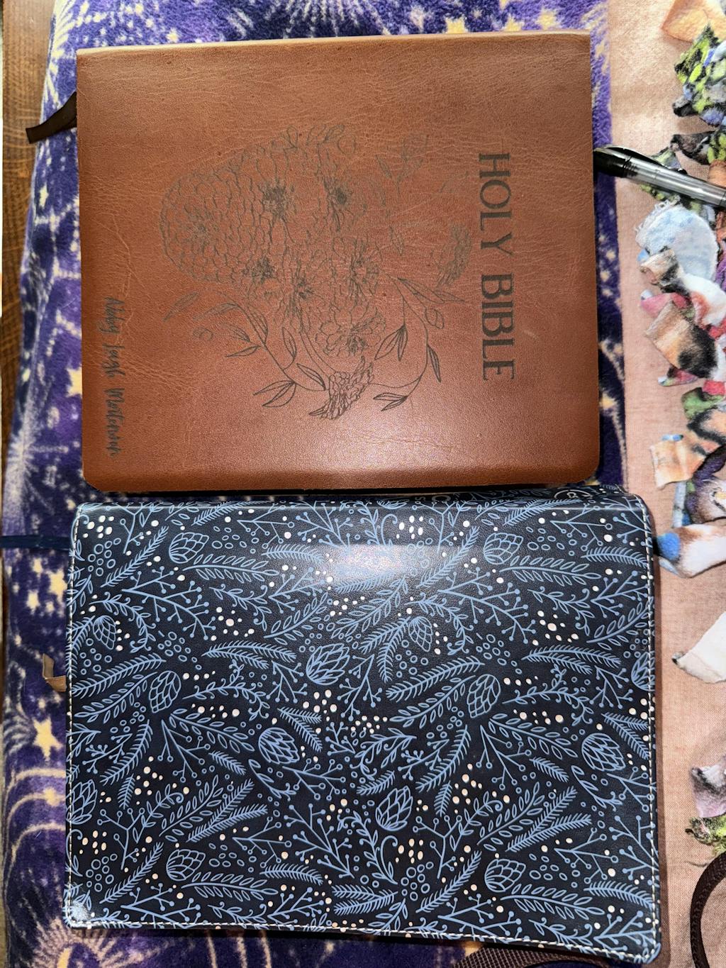 Choose from one of our 27 laser engraved custom designs for your Bible. We can also engrave your name on the bottom, right corner of your Bible in a simple font or hand lettered design.